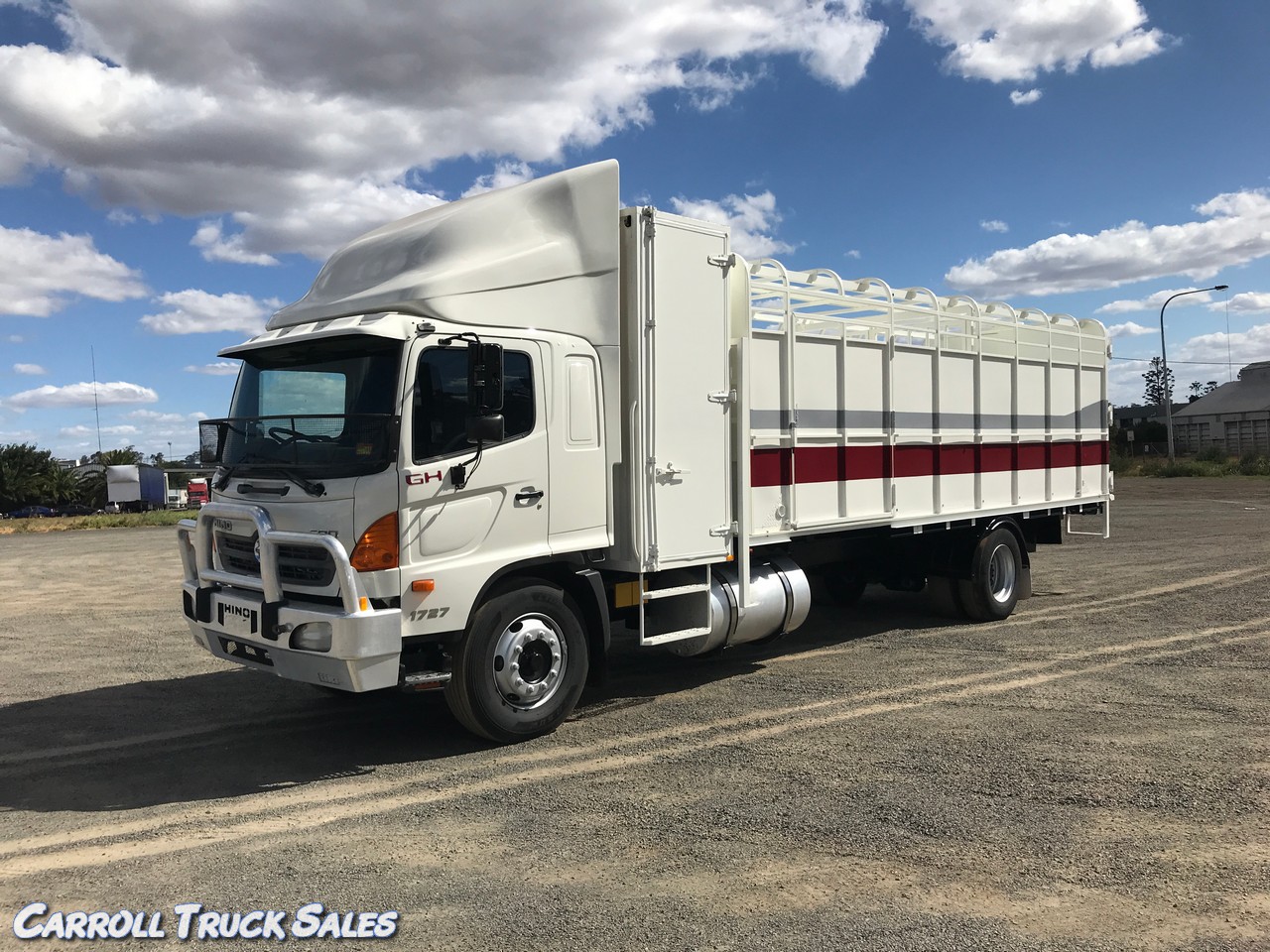 turbo 270 hp intercooled diesel motor, 9-speed eaton transmission, p/s a/c, 4x2, on air bag suspension, fitted with new custom built 23 ft steel tray and stock crate. Extras include: pull out alloy/ rubber ramp, front storage box, tool boxes, Ring Feeder, air trailer brakes, airfoil kit and many more. GVM: 16000 KGS. #0571