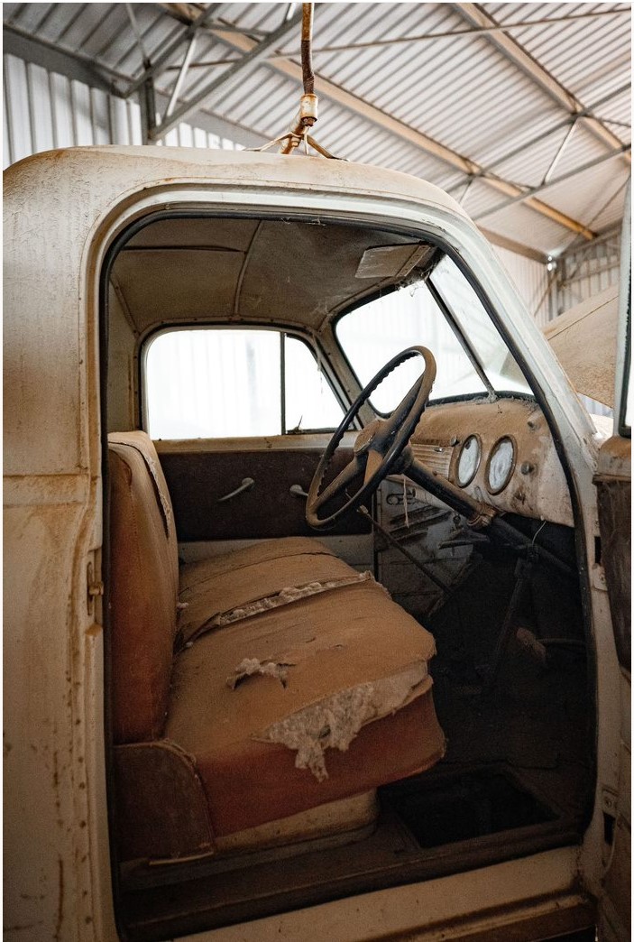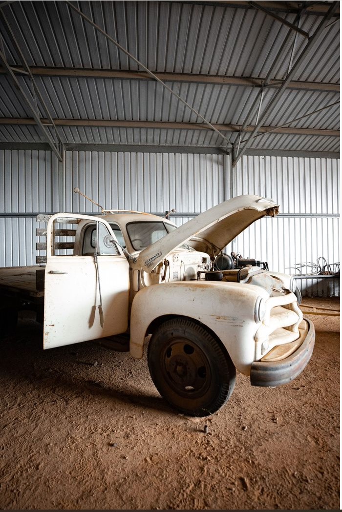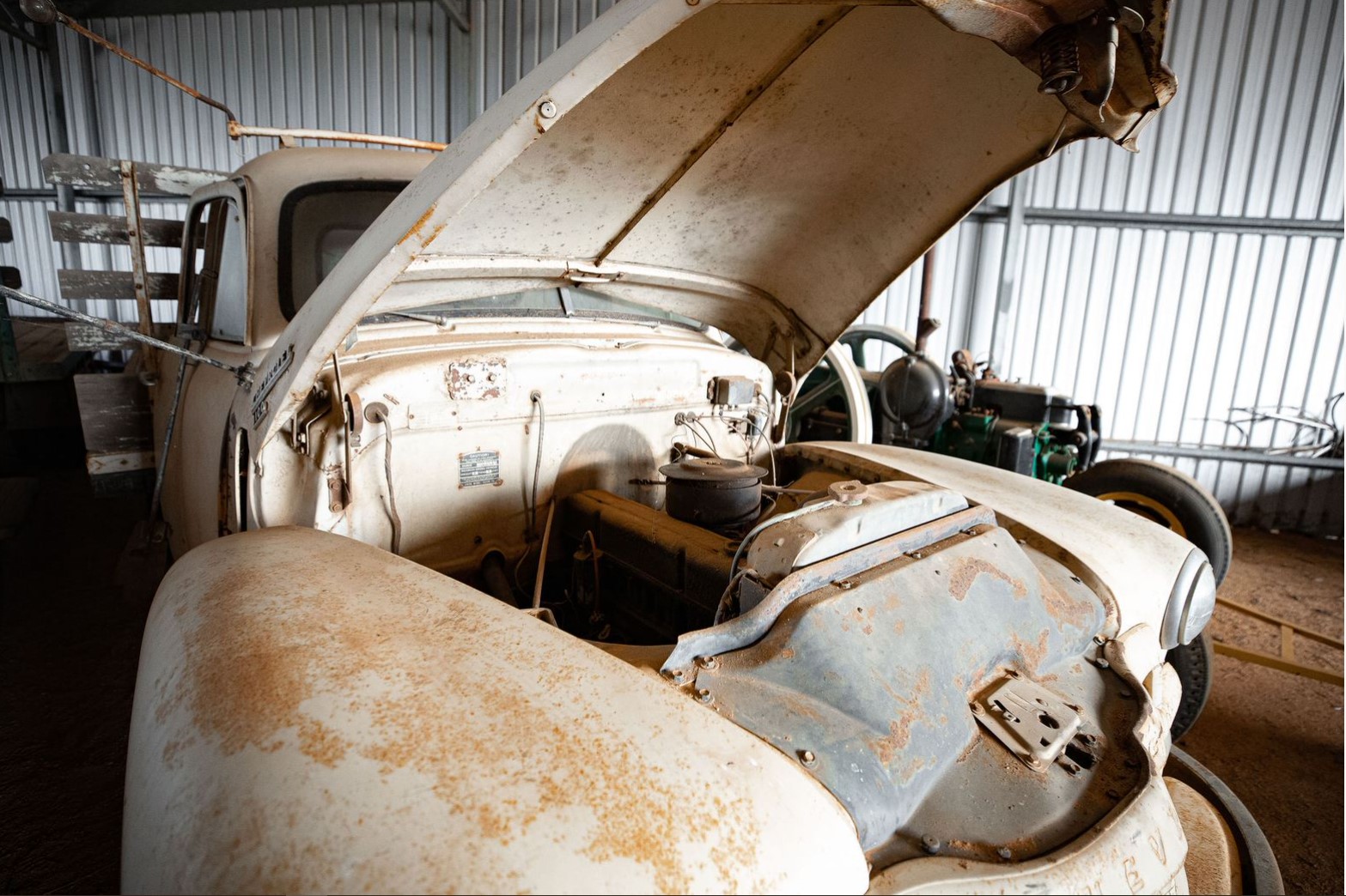 History unknown. Maximum gross vehicle weight: 6 tonne, 5 CWT. MODEL 1100 CHASSIS 161 DG BODY PLATE Holden STYLE NO. 7384900 BODY NO. 2049 TRIM NO. 50-387 PAINT NO. 253-16019 ACC NO. 11 ENGINE 6 cylinder OHV; 235 cubic inches; 4 speed floor shift ENGINE NO. TR50570