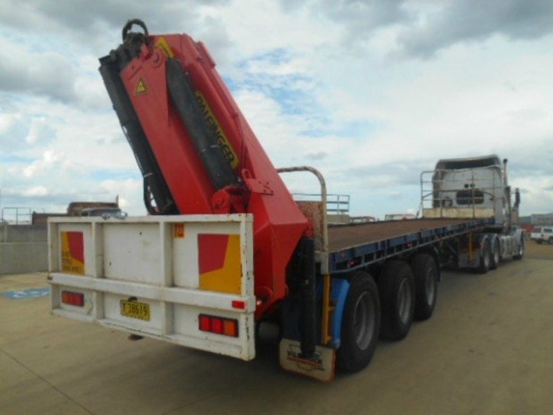 Freighter flat top with palfinger PK17000B crane. 3350kg @ 4.7M, 1630kg @ 9.3M. Tri-axle, spring suspension, 40ft trailer deck. Stock ref # 2580