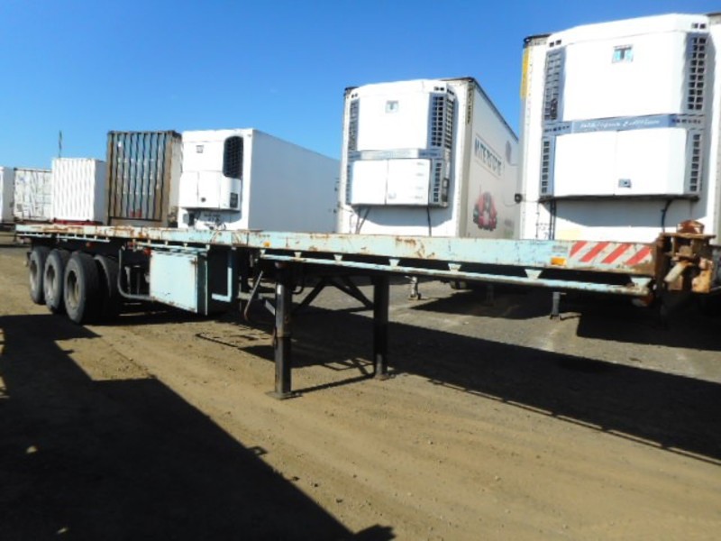Coming up for online auction 14th July to 19th July 2017. 01/1976 Fruehauf 40ft Flat top, 3 way Container pins, toolbox, 2 bay wheel spare tyre rack, Trailer is in fair condition for its age, stock Ref# 2767. Located at Western Traders Yard, Forest Hill Qld. See www.westerntraders87.com.au/auctions/ to register to bid. Need auction finance? Go to: http://www.westerntraders87.com.au/finance/