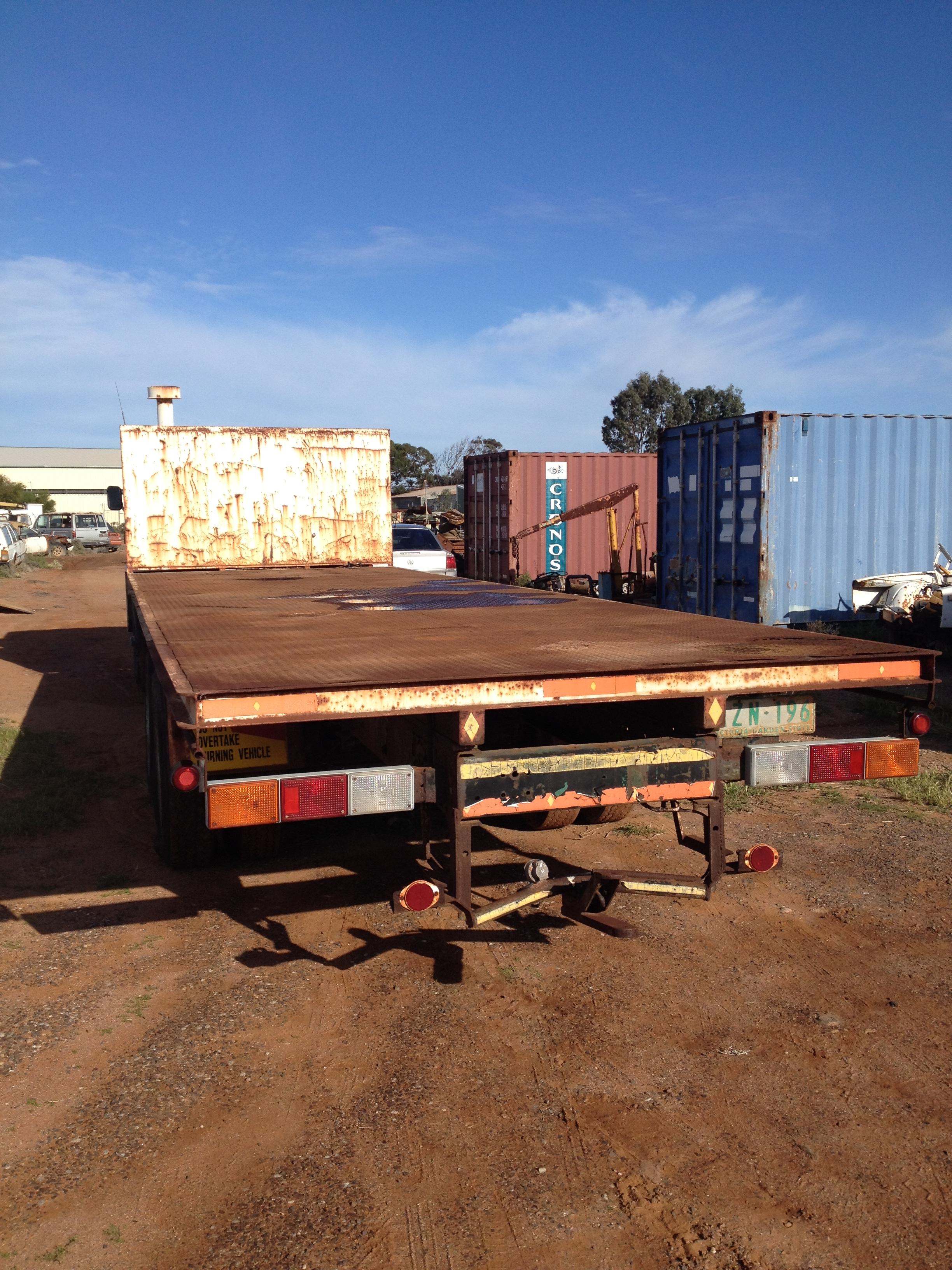 1810/B V8 petrol manual 5 speed split 28 foot tray dual axle one lazy axle runs drives cabin has rust.