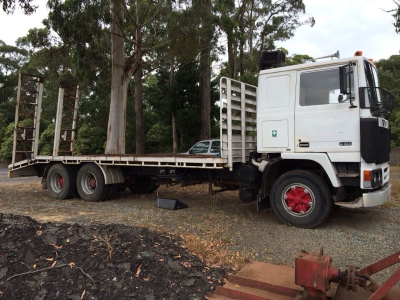 1982 VOLVO F10, beaver tail, 320 Cummings diesel, r/ranger box, rego to April, hydraulic motor/hoses for ramps (ramps no longer on truck), gates for tray. 12 ton carry. Used to tow 7t excavator/bobcat. Will consider swap or trade for 100 series landcruiser.