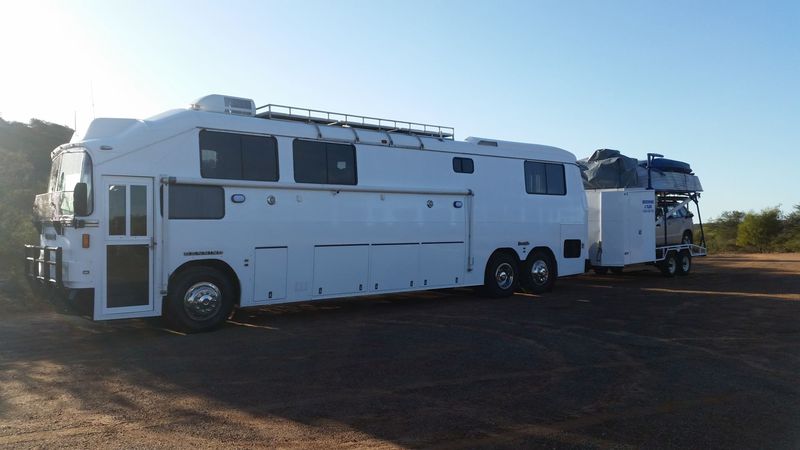 40 ft Denning Motorhome. Detroit 6V92T. 6 speed gearbox. Built 2006. Complete external re-sheet 2015. 3000W inverter/charger. 6 x 150W solar panels. 4 x 200A deep cycle batteries. 1000ltr water. Reverse camera, 21 ft awning with sides, gas hot water, 2 x TV's, vast box, home theatre, 2 x reverse cycle air cons, sep toilet/shower, queen size island bed, 390 ltr fridge/freezer, pantry, 7kg front load washer/dryer, jarrah fitout. Also 7m trailer with lockable shed at front & gantry to raise dingy onto roof.
