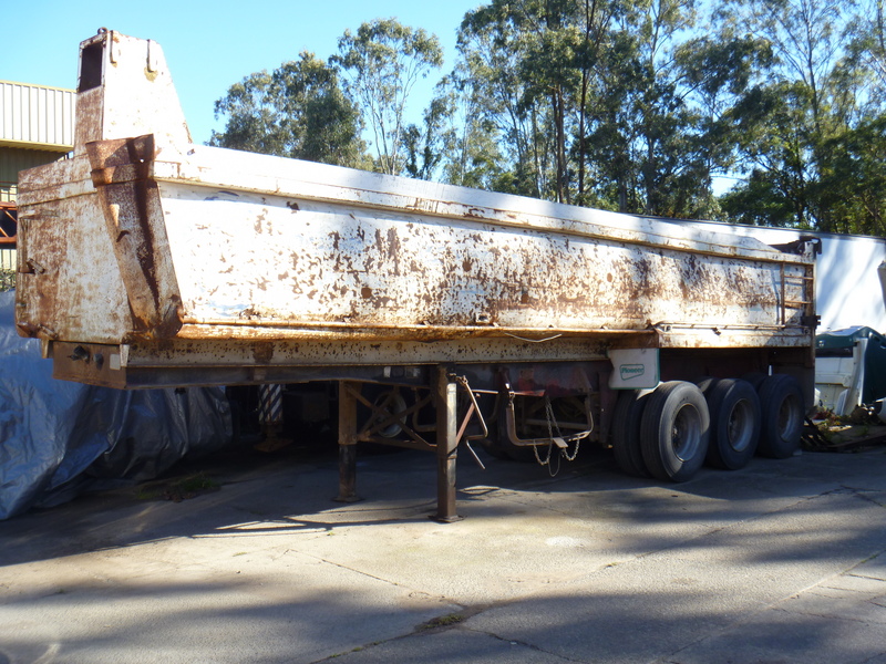Tri axle semi tipper, steel body, 9m x 2.49 x 1m two gate, damage to front corner of bin, needs repair. Sold as is, as traded.