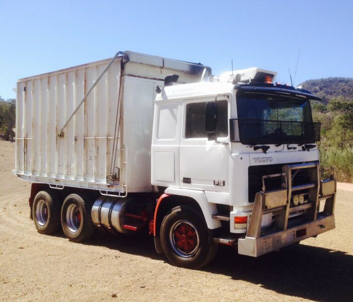 F12Volvo tipper/silage truck Great farm contractor truck 4.5m tray removable bin with load cells under pivot points Full weigh system including print out dockets Bartlet ball to tow tag or tipping trailer Red dot air con 400 hp 14 speed Volvo gearbox Bull bar oversize signs spotlights Great truck runs well 2 new batteries Roll top tarp Long range tanks Ready for work No time wasters.