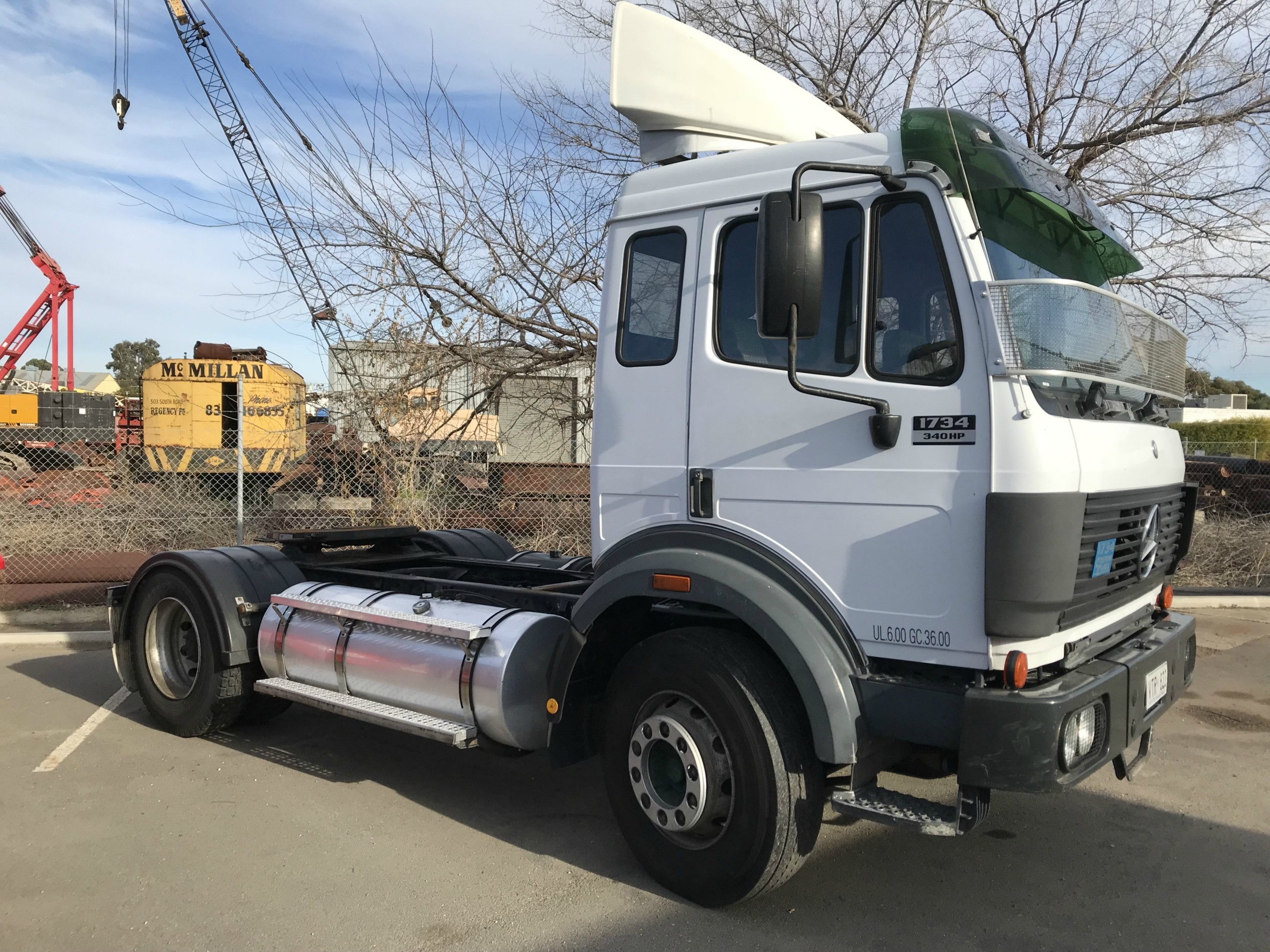 1994 Mercedes Benz 1734 4x2 Prime mover, 340hp engine, 13 speed Roadranger transmission, air bag suspension, Integrated sleeper cabin, Jost 50mm fixed turntable, Hydraulics <br>$12000 + $1200 GST = $13200<br>For further information please contact3<br><br>Neil Jungfer 0408 841 128<br>David Hill 0437 336 547