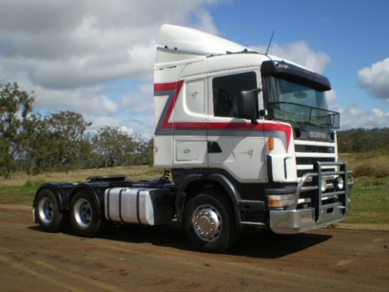 Scania R144G - 1998 model – 445,228 kms on speedo - 460 hp motor (recently re-built) - 14 speed syncro gearbox with retarder - bogie drive with spring suspension – alloy bullbar – PTO Hydraulics - GVM 28,100 kg - GCM 130,000 kg