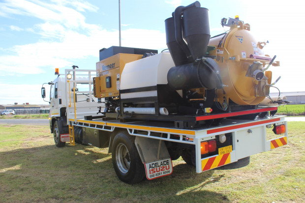 2004 Hino FG1J Steel Tray Top, 5.46L x 2.32W, *** VERMEER VAC UNIT Skid Mounted With Hook Lift Attachment with 5.9 Operating Hours Only *** Container Pins, Hose Reel, Pressure Washer Attachments, Amber Beacon Lights, Led Work Lights, Underbody Tool Box, Hand Washing Station, Heated Mirrors, Power Windows, CD Stereo, InCab Storage, Travelled 178,555 Kms!