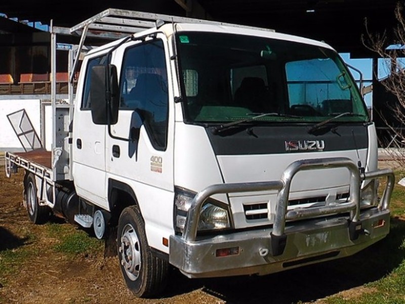 2005 Isuzu NPR400 Crew / Dual-cab Tray Truck, 4x2, 6-speed manual transmission, 7 seats, Leaf spring suspension.