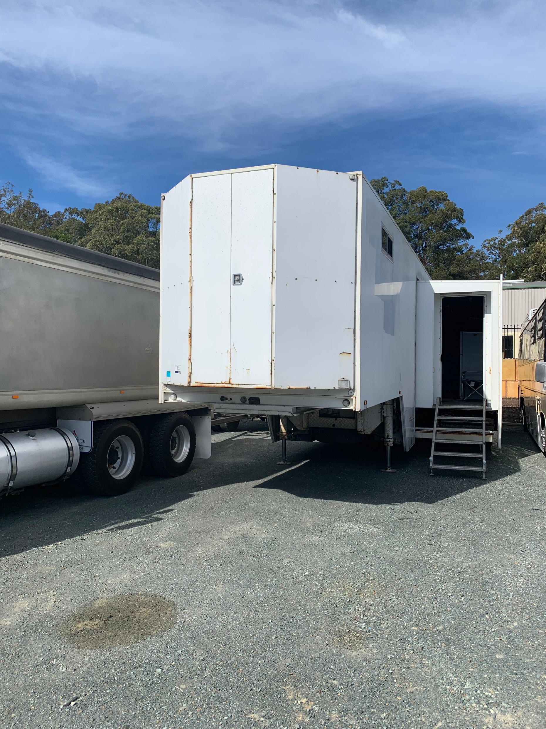 2006 EX GOVERNMENT BRIMARCO DROP DECK TRAILER, 14.5M LONG (47FT) FITTED WITH A HYDRAULIC SLIDE OUT 8.1M LONG X 4M WIDE, HYDRAULIC STABILIZER LEGS, WHEELCHAIR LIFTER, 240V EQUIPPED, AIR CONDITIONERS, SET UP AS A FIRE BRIGADE EDUCATION TRAILER, PLENTY OF OPTIONS FOR THE PERSON WITH AN IMAGINATION.