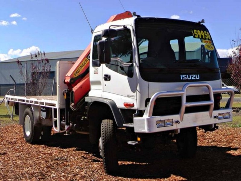 2006 Isuzu FTS750 4x4 Crane Truck Tray, high and low range 4x4, manual transmission, fitted with a big Palfinger PK12000. Truck and crane are well maintained, very tidy, and ready for work. Will sell with NSW roadworthy. 220HP turbo diesel intercooled engine.<br><br>117000 kms, VIN: JALFTS34H47000342, Engine: Isuzu 6HK1 220HP 7.80 Litre Turbo Diesel Intercooled, GVM: 13000 kgs, GCM: 20500 kgs.<br><br>Tray length: 4660 mm (15.29 ft), Tray width: 2485 mm (8.15 ft), Wheelbase: 4500 mm (14.76 ft).<br><br>2006 Palfinger PKG 12001 A Crane, Code: S208-SK-A, Serial no: 100035182, Lifting capacities: 3080 kgs @ 3.7 metres, 2180 kgs @ 5.1 metres, 1550 kgs @ 7.1 metres.<br><br>$59850 AUD (GST included). Delivery available Australia-wide at great prices, and free delivery to most East Australia locations.<br> <br>This 4wd truck is a short wheelbase, we also have a 2007 Isuzu FTS750 4x4 long wheelbase available.<br> <br>For more info, please call Darryn on 0417 699 769 or (02) 6765 3003.