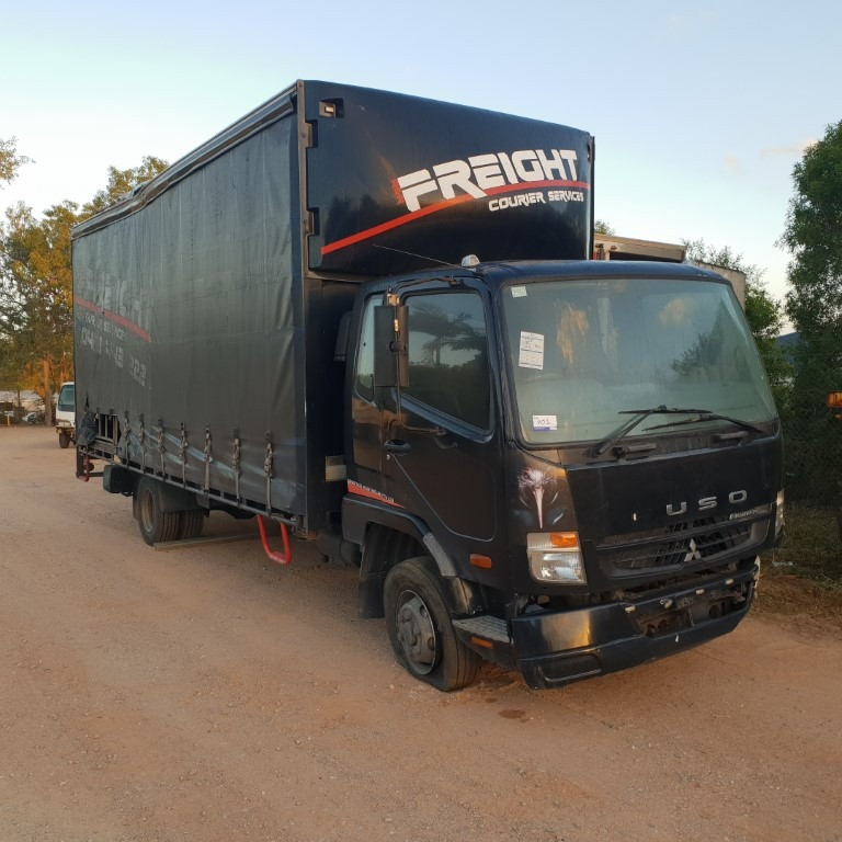 Wrecking Mitsubishi Fuso FK61F curtainside truck. Has good 6M60 turbo motor, 6 speed gearbox and alloy tailgate loader.