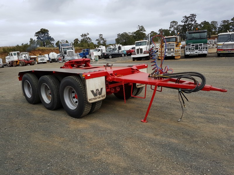 2010 SHEPPARD TRI AXLE DOLLY WIT SIDE TIPPER HYDROLIC LINES ON SPRING SUSPENSION 8.1 SPREAD NEW PAINT ON 10 STUD STEEL WHEELS , 50MM GREASELESS TURNTABLE.