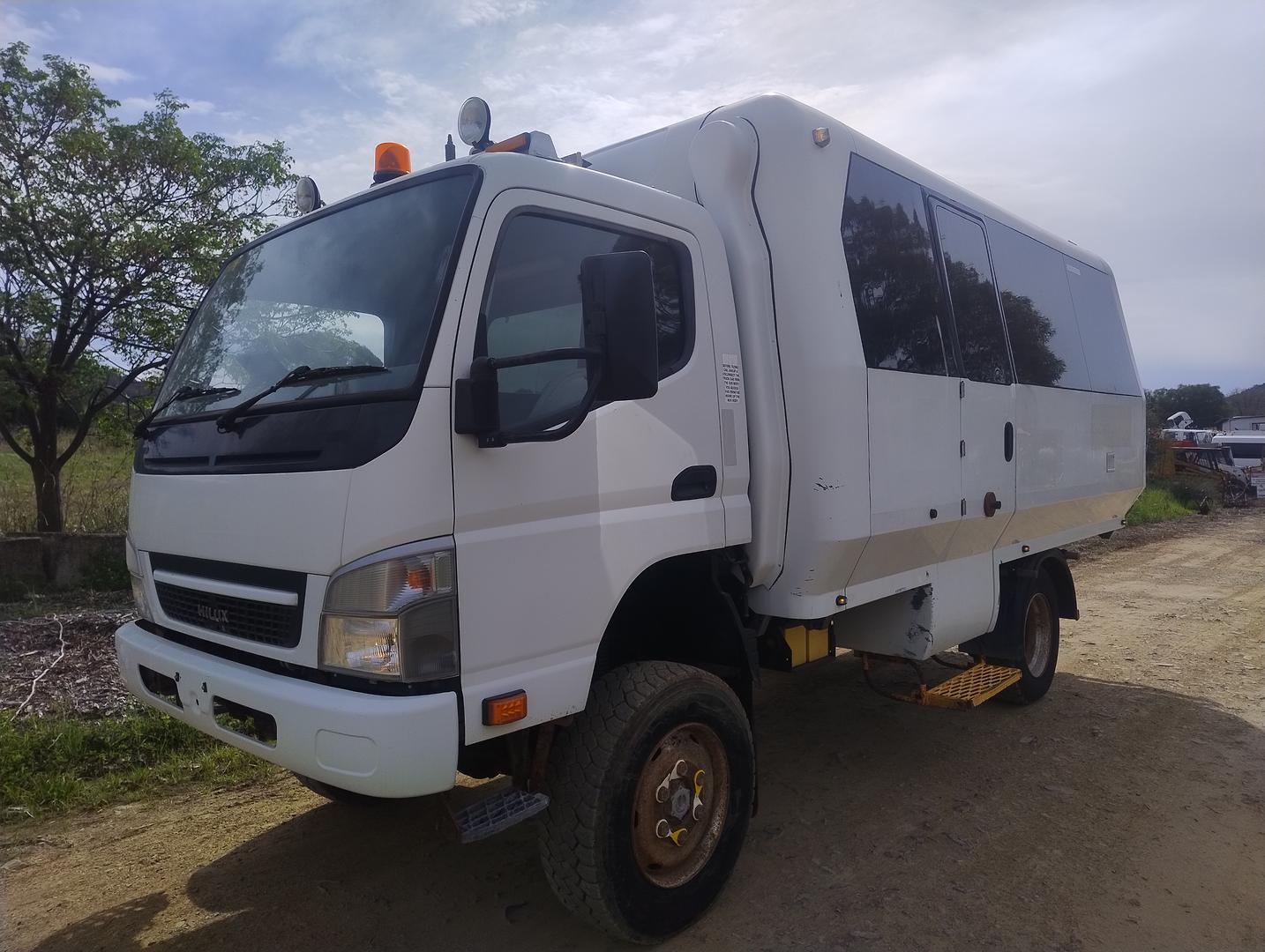 2010 Mitsubishi Canter 4x4 Bus, 18 seat bus body with crawl through from cab, would also make a great camper, fibreglass construction and is tall enough to stand up in. Runs and drives very well, 4.9L turbo diesel intercooled, high and low range 4x4, Super single wheels and tyres. This truck has been well maintained, but has surface rust on the chassis, and will suit someone with mechanical skills.