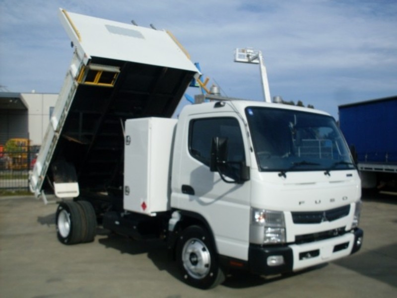 2011 Fuso 815 fitted with 3.2 x 2.3 metre steel tipper, 600 x 1200 tool box, underbody hoist, 500kg lift side loader, drop sides, 2 way gate, tow bar, flashing lights, reverse camera, electric brakes, power steering, air conditioning, 150 hp turbo diesel, 6 speed gearbox, 80000 kms.