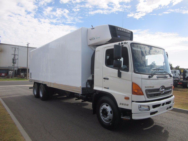 2011 HINO 2628 500 SERIES 6X2 REFRIGERATED PAN, 6 CYL TURBO INTERCOOLED 280HP, 9 SPEED MANUAL, SPRING SUSPENSION, FITTED WITH FIBREGLASS 7.8MTR LONG REFRIGERATED PAN, 2.5 HIGH, 2.5 WIDE, CARRIER SUPRA 950 UNIT, ELEC STANDBY, REAR BARN DOORS AND 2500KG TAIL GATE LIFTER, 24,000GVM, 32,000GCM.