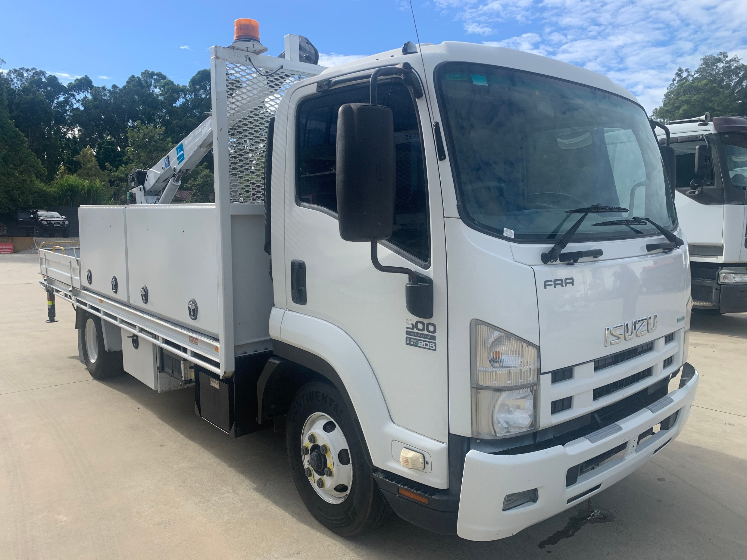 2011 ISUZU FRR FITTED WITH A 5.2M LONG X 2.5M WIDE X .3M HIGH DROP SIDED TRAY FITTED WITH TOOLBOXES, AIR COMPRESSORS, RETRACTABLE HOSE REELS, MAXILIFT COBRA 6600 ABLE TO LIFT 3T @ 1M & 830KG @ 6M, REMOTE CONTROL