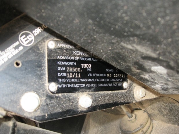 2011 Kenworth T909<br>> Cummins ISX-EGR-600HP/2050 LB FT 6Cyl Diesel Engin<br>> Fuller RTLO22918B 18 Speed Trans<br>> Neway AD 246/10 Rear Suspension<br>> 50" Sleeper<br>> Stoodley BullBar<br>> One Piece Stainless Steel Guards<br>> Pure Air Bunk Air-con<br>> Hydraulics<br>> Super Singles Fitted<br>> 130,000kg GCM Rated<br>> Turbo @ 3200,000kms<br>> EGR Cooler & EGR Valve @ 477,000kms <br>> Full Service and Engine History<br>> Regular Servicing<br><br>Please contact Mark Clements of Kenworth Sales on 0419 234 018 for further informationr