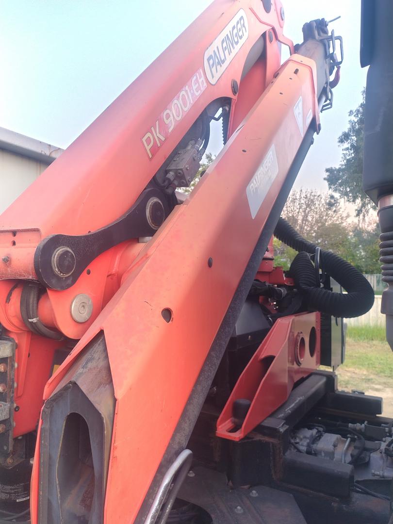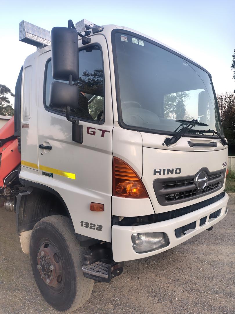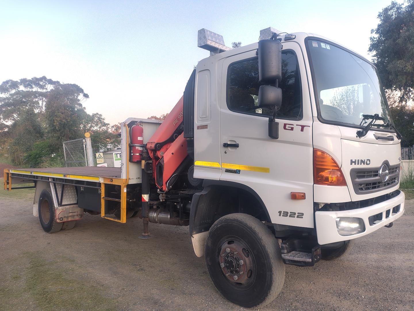 2012 Hino 500 GT 1322 4x4 Crane Truck, steel tray fitted with container pins, Fitted with Palfinger PK9001EH with remote, 13 t GVM, 21 t GCM. Currently in our workshop being checked, serviced and prepared for roadworthy.