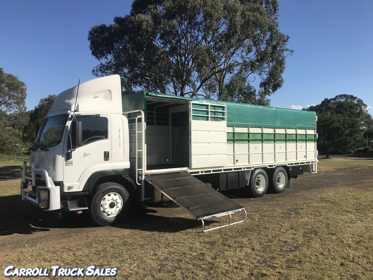 SI-TEC 6 CYL TURBO INTERCOOLED, 9 SPEED MANUAL, P/S, A/C, ON AIR BAG SUSPENSION. Extremely tidy truck fitted with NEW T.W.E steel tray with pull out alloy/rubber ramp, T.W.E horse/cattle stock crate. Extras include: Air Glide tow hitch, rubber floor, horse dividers, catwalk, side and rear access, 400L fuel, 400L water, tarp roof with roll sides, 2x dog boxes, 2x toolboxes and the list goes on. Fully set up, ready for use. HARD TO FIND SET UP LIKE THIS. GVM: 24,000kgs. #0448