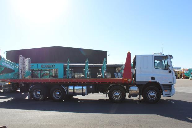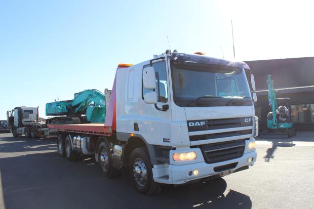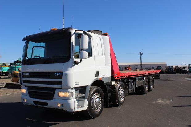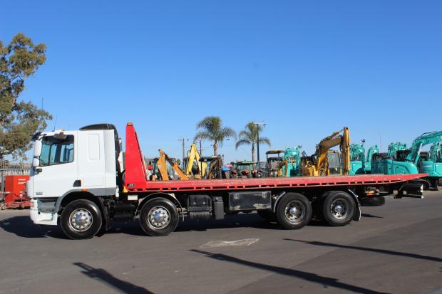 2014 DAF CF 75-360 Twin Steer Tiltslider. Tray Measures 8.5m (L) x 2.47m (W). Fitted with 30 Tonne Rated Super Winch, Underbody Toolbox, Work Lights, Amber Beacon Lights, 400L Fuel Tank, Stabilizer Legs, Hand and Remote Control Operated, Air Conditioning, CD Stereo, Air Conditioning, Power Windows, Electric Mirrors, Sleeper Cab, Drivers SRS Airbag, UHF Radio, Automatic Transmission, 360HP Turbo Diesel Engine, Airbag Suspension, Travelled 745,333kms