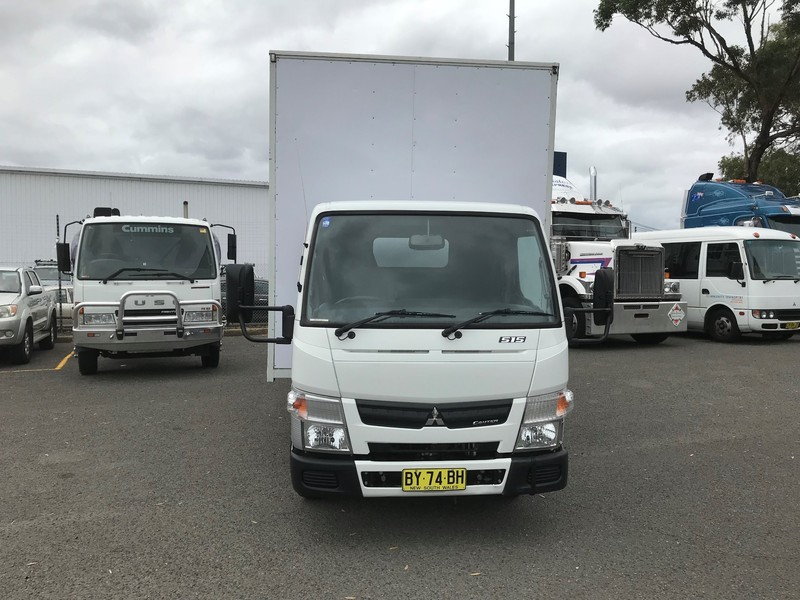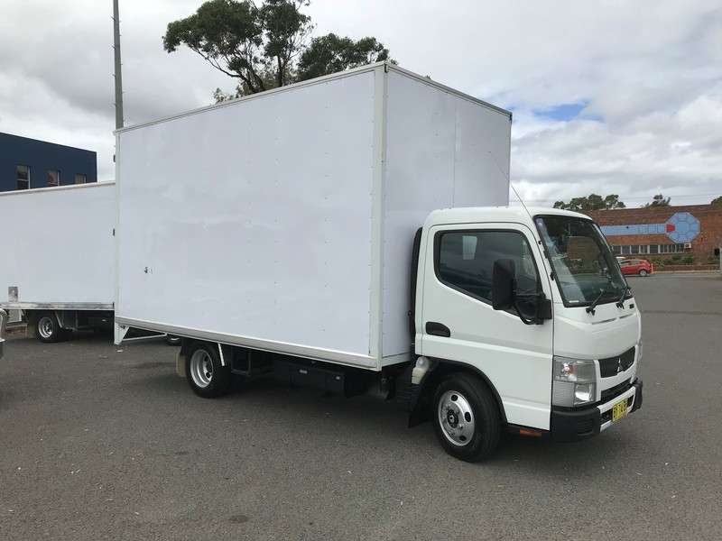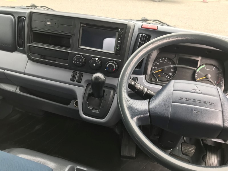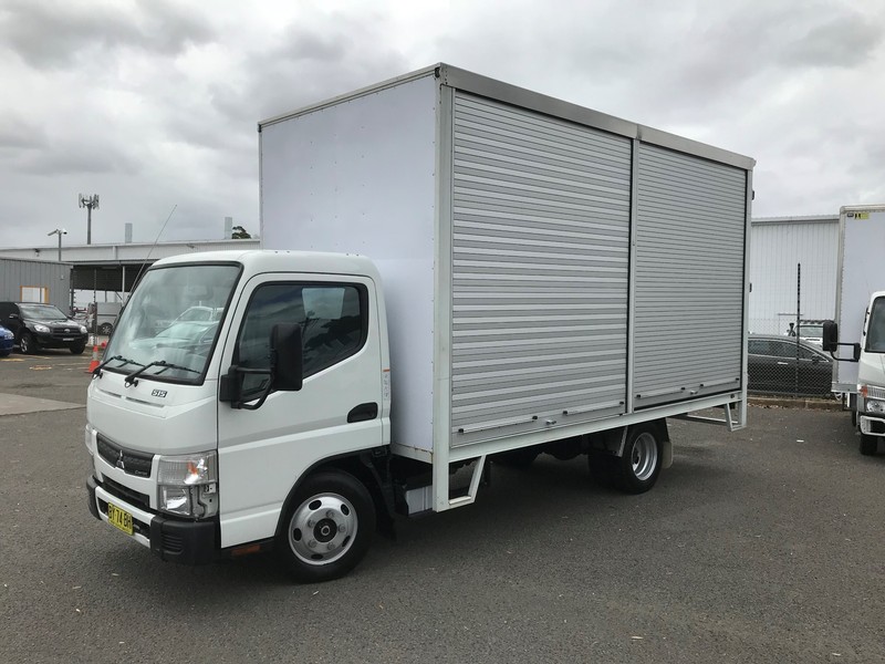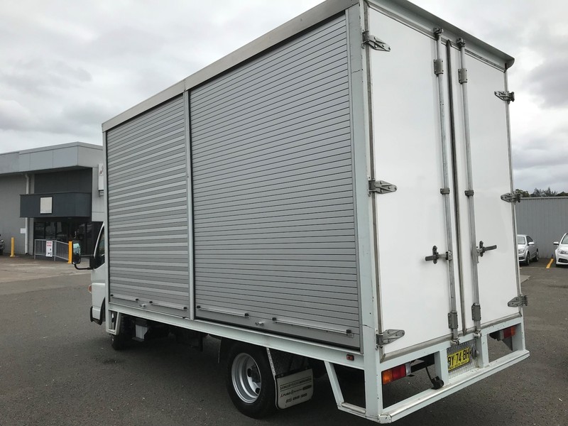 2014 MITSUBISHI FUSO CANTER 515 NARROW PANTECH. DRIVE WITH CAR LICENCE. 4CYL TURBO DIESEL @110KW, DUOTRONIC AUTOMATIC 6 SPEED TRANSMISSION, TOUCH SCREEN AUDIO, REVERSE CAMERA WITH DEDICATED MIRROR MONITOR, AIR CON, ABS, POWER WINDOWS, PANTECH BODY WITH BARN REAR DOORS AND 2X SIDE ROLLER DOORS, 4500L X 2250W X 2500H,