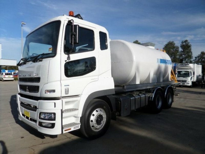 2014 FUSO FV51SK WATER TRUCK 13,000LTR, 6x4 12L 360HP, 12 Speed Automated Manual, ABS braking plus ASR, CD Player / Radio, Air Conditioning, Keyless Entry, Satellite Navigation, Genuine in-dash FUSO reversing camera installed , 40,000km Service Intervals, 3 Year / 200,000km Factory Warranty, - Low profile heavy duty 13,000 litre poly water cartage transport tank. 10 Year tank and sub frame warranty. L.E.D. Combination tail lights and LED Side clearance lights and beacons. Live drive hydraulic water pump drive system inc. water pump speed controller. Hydraulic system coupled to heavy duty GMP Pedistal 80 x 80mm cast iron water pump inc. 3`` valved pump outlet. Pressure relief safety check valve fitted into pipe work. Top-fill funnel system inc. regulation air gap, Dam suction system via GMP pump unit , Left and right 2`` front 'gutter flusher' duckbill sprays, Centre, Left and right 3`` rear fan sprays, 3`` Rear pressure bar fitted with13 brass v-jet nozzles removable end caps for flushing, All sprays and pressure bar are electric over air actuated and in-cab controlled, 2 ½`` Heavy duty water cannon inc. 8 Way in-cab joystick controller and in-cab electric adjustable nozzle, 1`` Tap outlet with ballvalve, Tank water level sight glass fitted into tank at front and rear, Spring loaded retractable hose reel fitted with 20 meters of wash down hose and fire fighting adjustable nozzle, Suction hose storage racks each side of tank, Heavy duty, weather proof, lockable, under body toolbox, Underbody 60ltr hand wash tank with soap dispenser. Access ladder and gantry to tank manhole.
