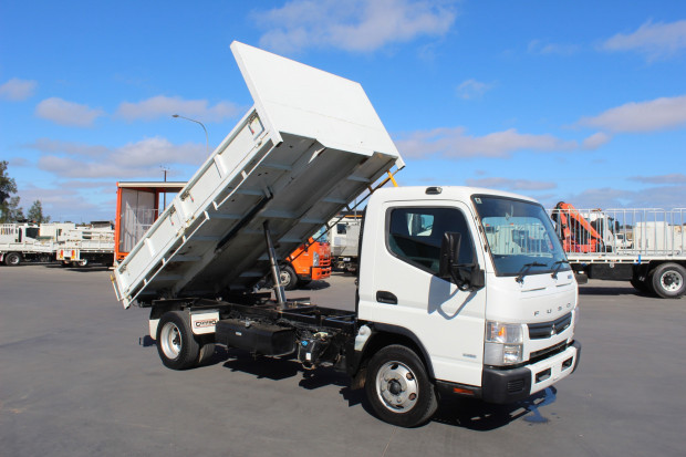 2016 Fuso Canter 918 Tipper. Measures 3.65m (L) x 400mm (H) x 2.19m (W). Fitted with Drop Down Sides, Two-way Tailgate, Electric Brakes, 50mm Ball Tow Bar, Step Access into Body, PTO Powered, Air Conditioning, CD Stereo with Bluetooth Connectivity, 100L Fuel Tank, 4 Cylinder Turbo Diesel Engine, 5 Speed Manual Transmission, Only Travelled 34,386kms
