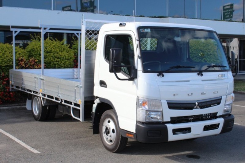 Fuso Canter 515 Trademate Wide Cab. 4420 (L) x 2050 (W) Alloy Tray with 2.5T Floor, H/Duty Alloy Flush Loading Headboard, 32mm Full Length Tie-Down Rails. 300mm Split Dropsides, Removable Centre and Rear Rack and Towbar.