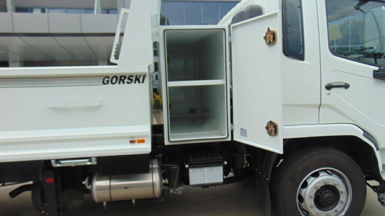 2024 Fuso Fighter 1627 Fighter White Tipper 7.5l 4x2 - NOTE: Plus on road costs. Gorski Tipper, 6100 long makes for a great machinery transporter, and also able to tow up to 9 tonnes on the included pintle hook. Comes with a full width toolbox, inspection ladder, hand held remote for the control of the tipper body. Tare is 7,560, Payload @ 15,000 kgs would be 7,440 kilograms. Call the new Fuso sales team to inspect.