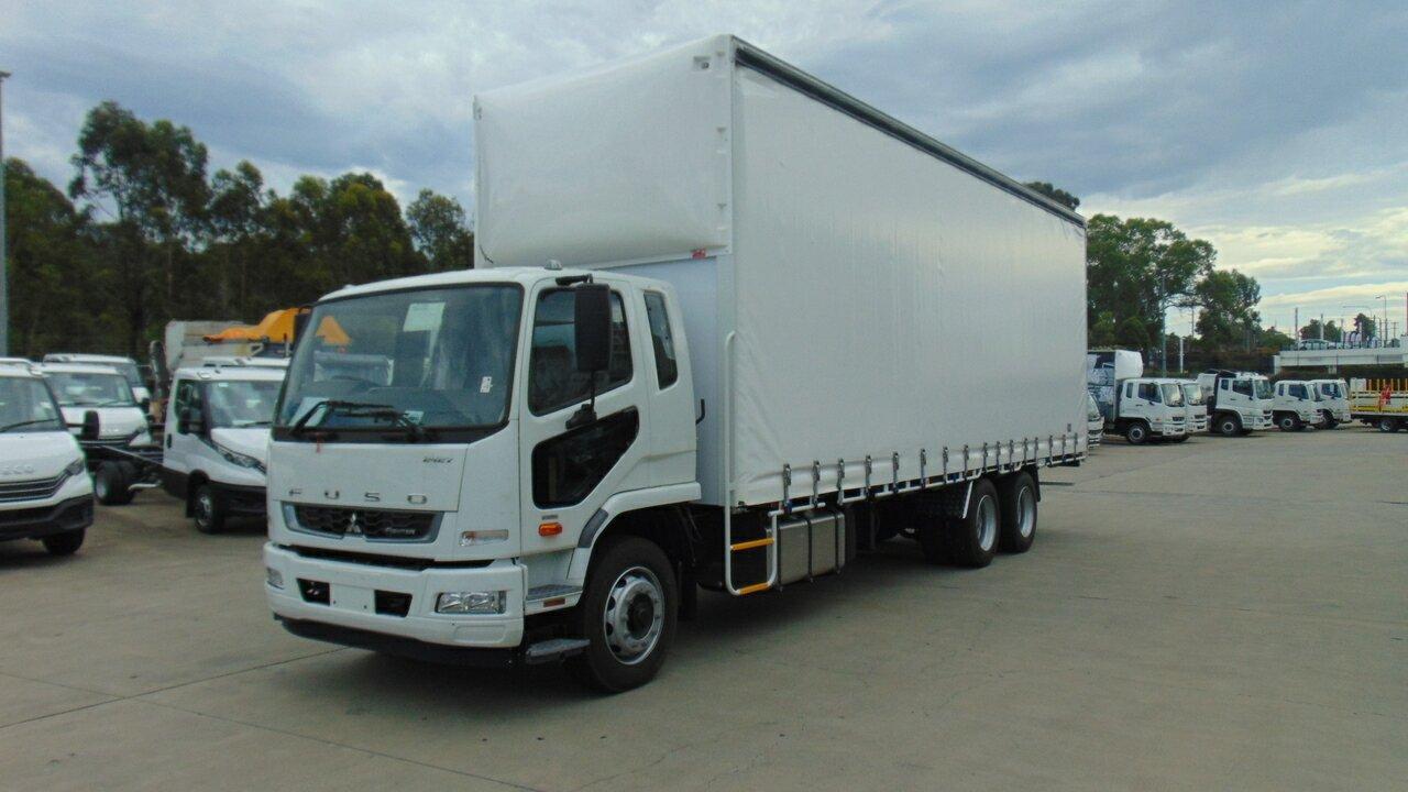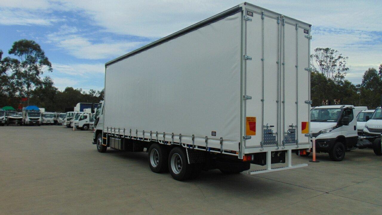 2025 Fuso 2427 Fighter White Curtain Sider 7.5l 6x2 - NOTE: Plus on road costs. 2025 Model Fighter 2427 6 speed Allison Automatic, 14 pallet tautliner, barn rear doors. Load restraint curtains, Strap and Go system, 7 winches on track, 1200mm Black toolbox Call the new Fuso Sales team to arrange an inspection