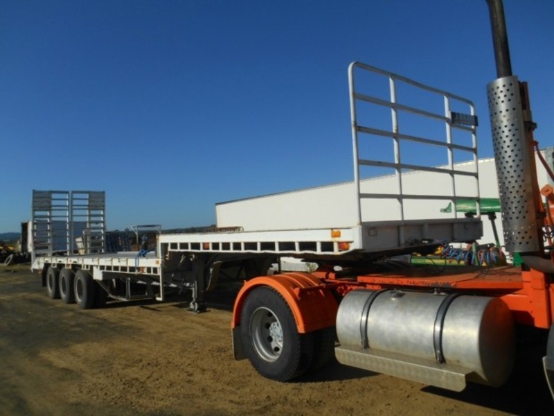Circa 1985 Unknown Drop Deck Trailer. 44ft Tri-Axle, Spring Suspension. Heavy 6mm Floor with 5 inch combing. Hydraulic Ramps. Ideal for Excavator mover or property. $16500. Stock Ref #2391