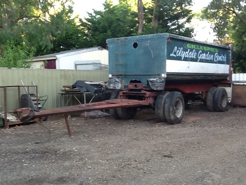 2 axle dog tipper. Rough condition. BPW axles, Ringfeder coupling, aluminium body that has been lined with steel, in poor cond, the hoist leaks, tyres are poor cond. No reg no RWC, as is, where is.