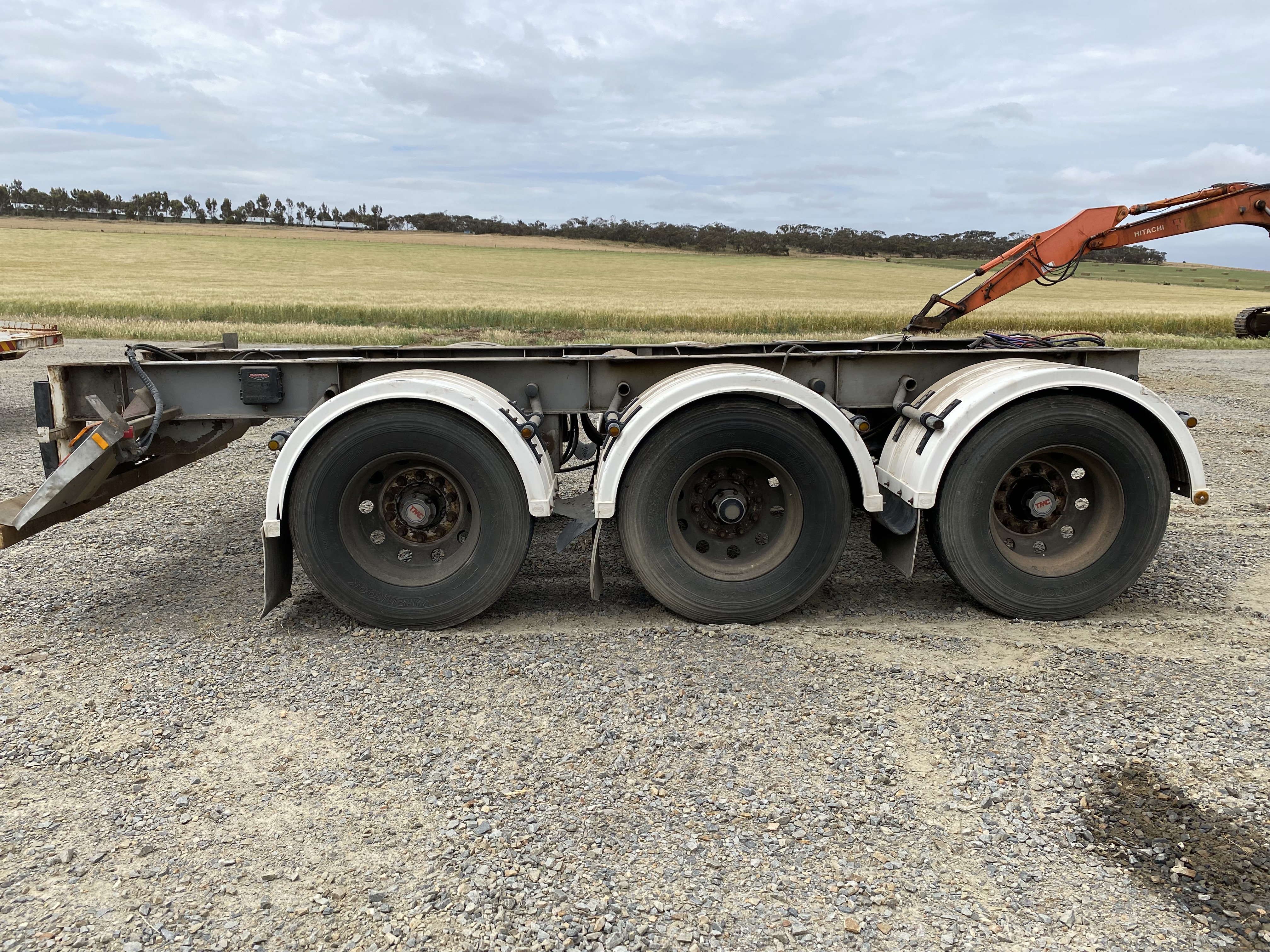 Just removed tri-axle trailer assembly, running under Freezer Liner - Pantech removed to use as storage unit. Complete wheel and axle assembly removed in-situ. Air bag, trailer plumbing, Right Weigh load scales. No Plates, Towed to current site. Road train rated, air bag, late model unit. 10 Stud wheels, 6 wheels only. Must be sold.
